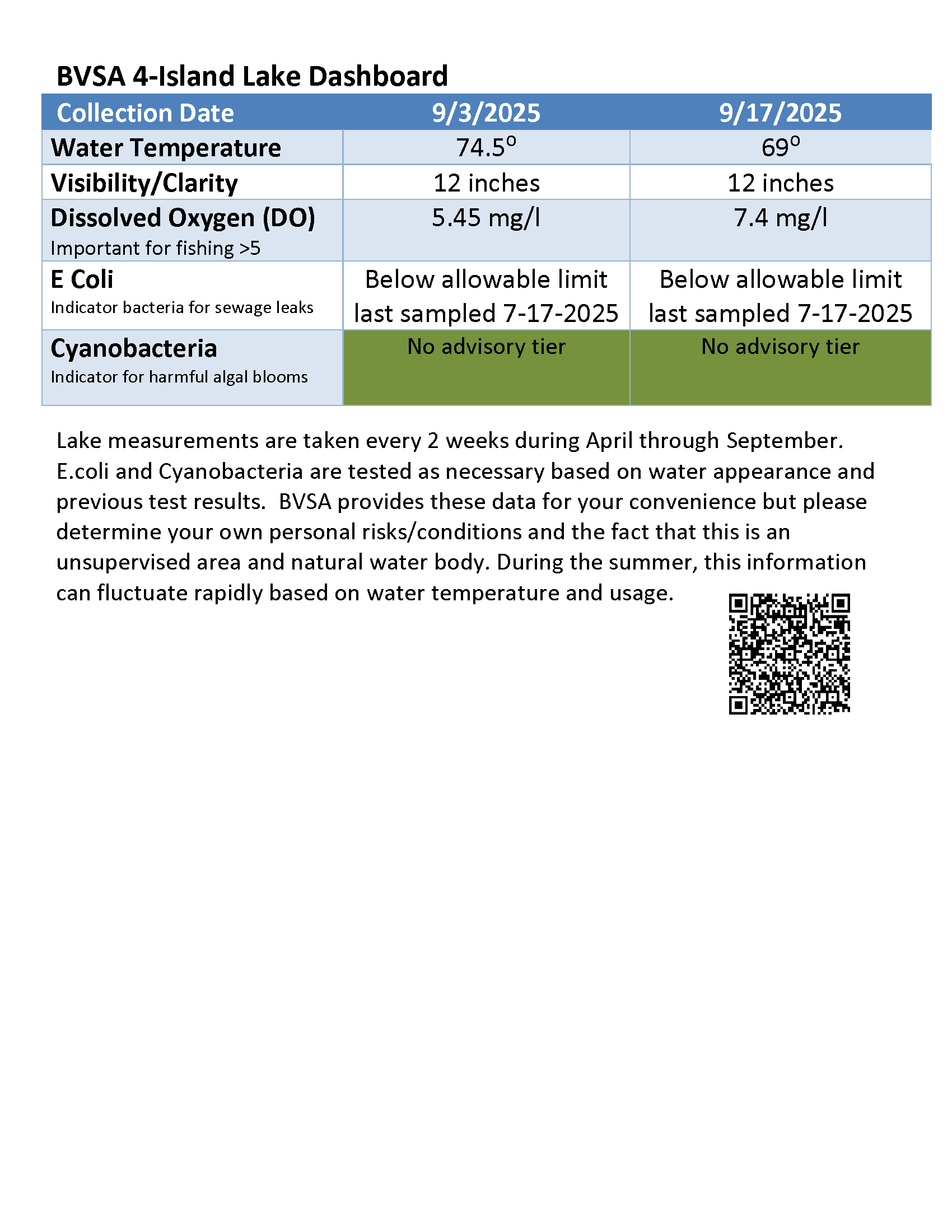 Lake measurements are taken every 2 weeks during April through September. BVS provides these data for your convenience but please determine your own personal risks/conditions and the fact that this is an unsupervised area and natural water body. During the summer, this information can fluctuate rapidly based on water temperature and usage.